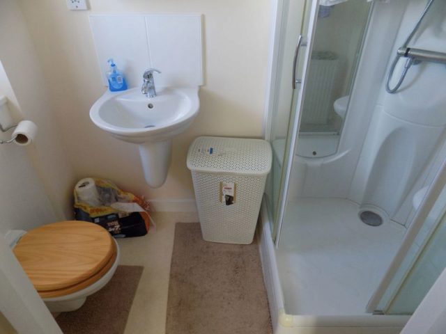 Comprising shower enclosure with wall mounted shower and fitted seating area, screen door, WC, wash basin, radiator, shaving point, uPVC double glazed window, coving and smooth plastered ceiling