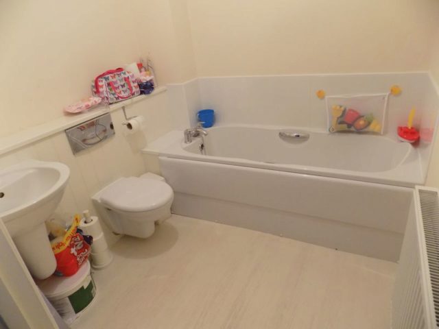 Modern white 3 piece suite comprising panelled bath, wash basin, WC with concealed cistern, shaver point, radiator.