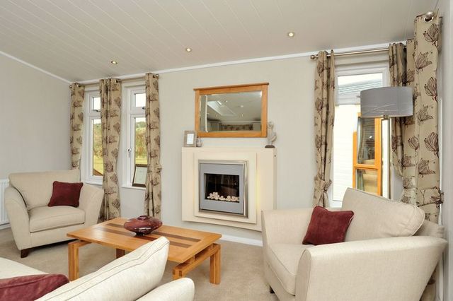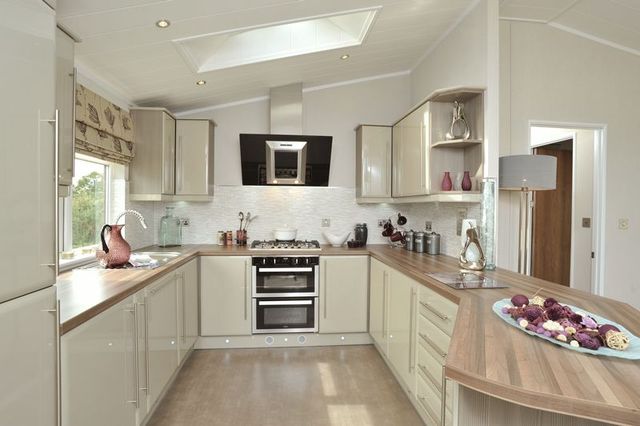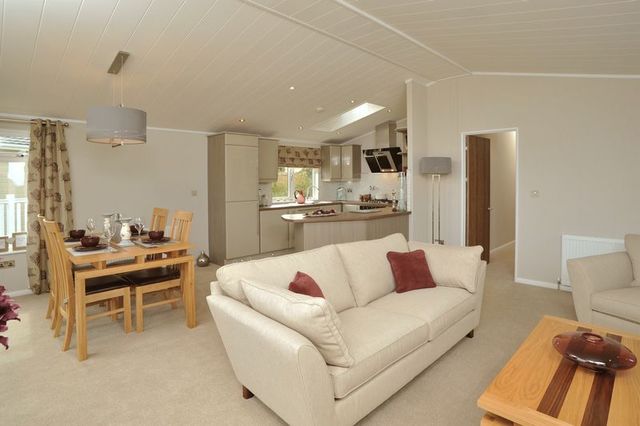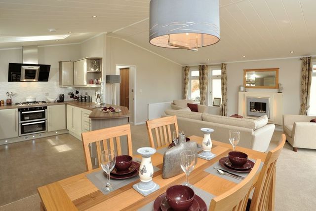 For many years the Kingfisher has been the most popular lodge in the UK and it is not difficult to see why. Fantastic build quality and beautiful de'cor, combined with a stunning open-plan living area make this the residential lodge others try to imitate. The Kingfisher is built to British Standard 3632, which is the residential standard that all Omar Park Homes and Lodges are built to. Whether it's for residential use or for your holidays and leisure time, this home suits every occasion. Its fully fitted high gloss designer kitchen is a dream for any cookery connoisseur... or just relax in the fully tiled body jet corner shower in the bathroom.Specification•Light Oak / PVCu double glazed windows (10 year frame / 5 year glazing warranty)•1 off large feature dormer•2 sets of French doors to front•Metrotile roof (40 year warranty)•Semi-vaulted ceiling throughout•Feature interior and exterior lighting•Gas central heating•Feature electric fire•Dining table and chairs•Hessian backed carpet with underlay•Fully lined curtains throughout•Marks & Spencer's style sofa and chairs•Built under electric oven and 5 burner gas hob•Integrated fridge/freezer (50/50 split)•Integrated dishwasher and washer dryer•High gloss Mink kitchen doors and drawers•Wall hung basin and vanity unit to bathroom and en-suite•Heated towel rails to bathroom and en-suite•Shower room with sauna off hall (selected floor plans only)•Quadrant cubicle with body jets shower