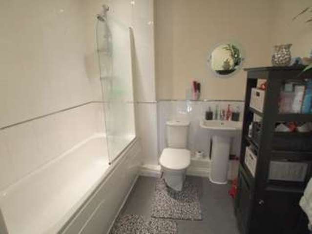 Fitted with a modern white suite comprising pedestal wash basin, panelled bath with shower over, shower screen and low level WC. Tiling to walls and shower area.