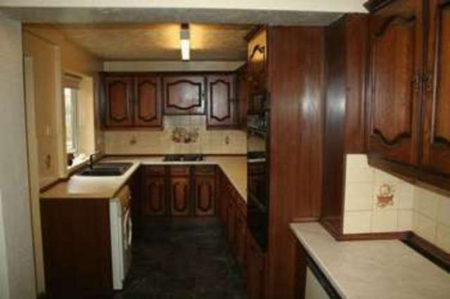Having a range of units in 'dark oak' style with matching wall mounted kitchen cabinets. Inset the roll top work surface is a single drainer sink unit ith mixer tap. There is plumbing for an automatic washing machine, provision for an electric cooker with extractor hood above and heating is provided by a central heating radiator. Off this room is a handy storage pantry. The kitchen has been finished off with matching splash back tiles. Exit from the kitchen leads out onto the rear garden area.