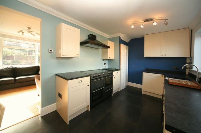 Set back form the road, the property is reached by a pedestrian walkway with central green, providing a good deal of privacy. There is a good sized sitting room with large double glazed windows overlooking the enclosed front garden, with an archway leading to the dining kitchen to the rear. The kitchen has a smart range of matching wall and base units with Belfast style sink inset into the work surface. There is also a useful pantry cupboard to one end with plumbing for an automatic washing machine. Double doors open out from the dining area to a large decked area.