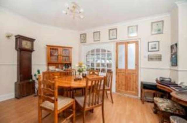 Lounge/diner22' max x 14'11\" (6.7m max x 4.55m). Double glazed window to the front, open brick fireplace with wooden mantel over, laminate flooring, telephone point, radiator, dado rail, coved ceiling, feature single glazed window through to the kitchen, door to: