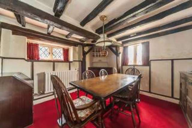 Leaded-light windows to front and side. Exposed beams to ceiling and walls. Built-in cupboard. Radiator. Door to kitchen