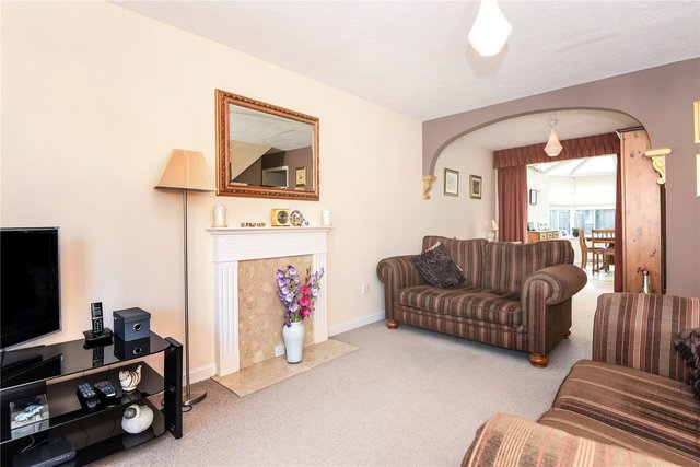 Living Room 25'8\" x 12'10\" (7.82m x 3.91m). Front aspect bay window, an under stairs storage cupboard and an opening to the dining room.
