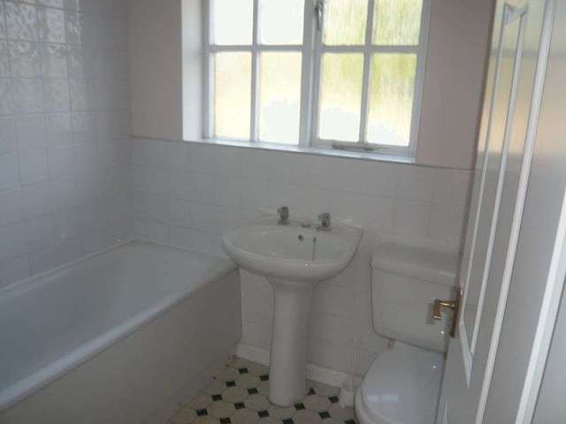 White suite comprising of bath with shower mixer, pedestal basin and W.C., heated towel rail