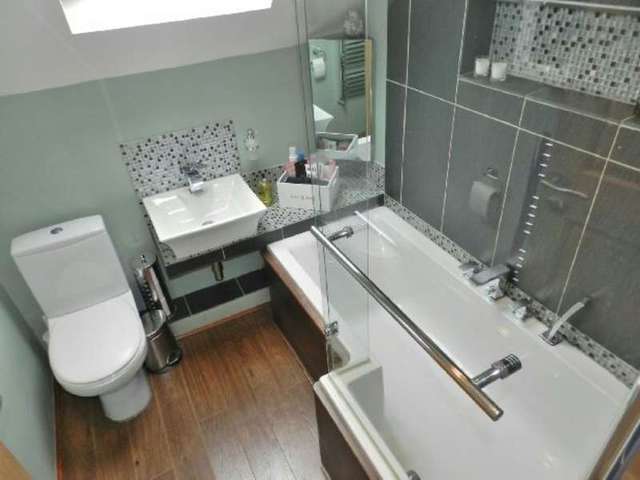Bathroom: The luxurious bathroom has a contemporary white suite including a 'P' shaped bath with central mixer tap and an overhead mains chrome rain shower head with an additional hand held shower head, hand basin with mixer tap set in a tiled surface and low flush w.c., tiling to the walls by the bath and sink areas, chrome heated ladder towel radiator, Velux window with blind and laminate flooring.