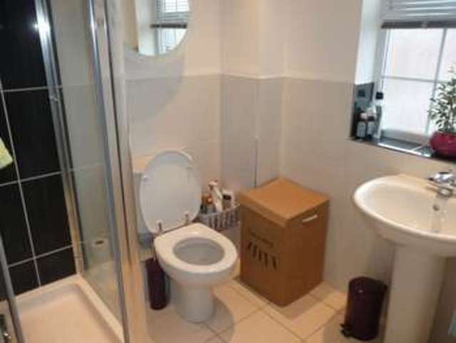 Modern refitted white suite comprising tiled shower cubicle with fitted shower, low level WC, pedestal wash hand basin, colour co-ordinated tiling to principal areas and flooring, heated towel rail, obscure uPVC double glazed window to rear aspect, inset spot down lighters, extractor fan.
