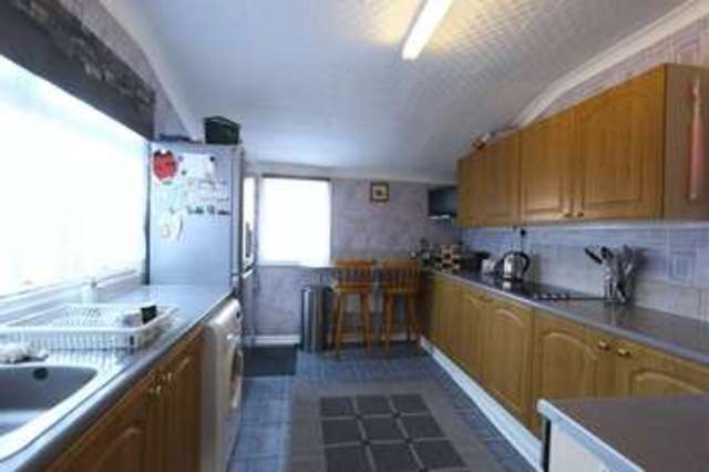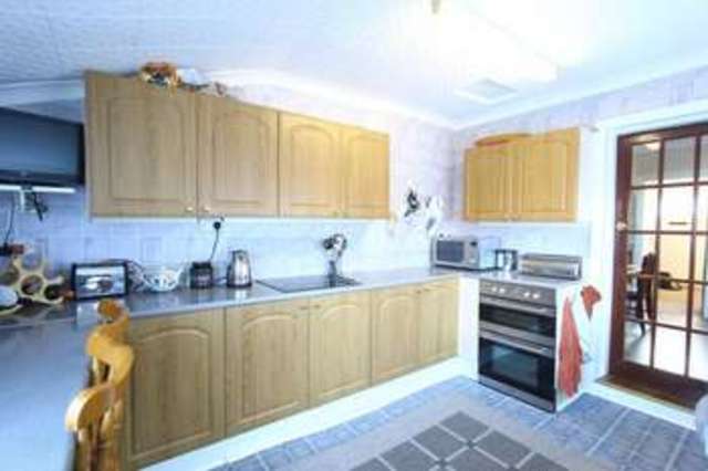 With wall and base level fitted units, work surfaces over, stainless steel sink and drainer unit, Breakfast bar, integrated double oven and hob and space for fridge/freezer.