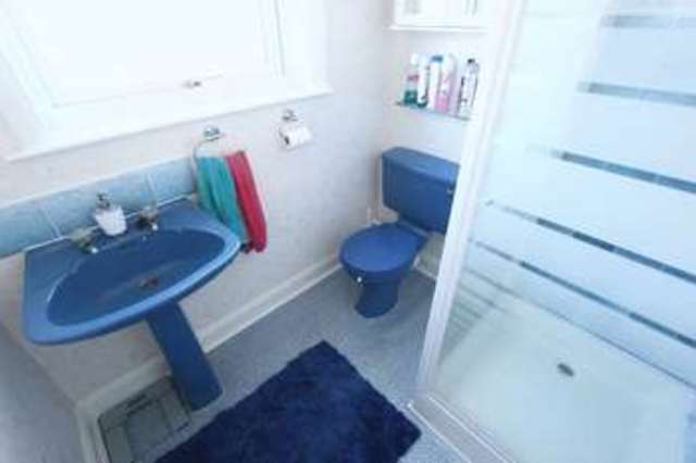 With shower cubicle, low level WC and pedestal wash hand basin.