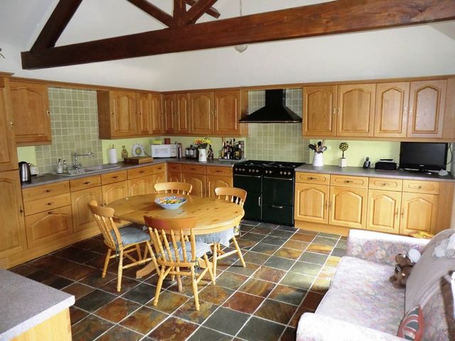 A farm house style dining kitchen incorporating a one and a half bowl single drainer sink unit with mixer tap built into a L shape roll edge preparation work surface with a wide selection of base cupboards and drawers, matching eye level wall units. A kitchen dresser to one wall with glass display cabinets, integrated concealed fridge, freezer and dishwasher, range cooker with extractor fan above, natural slate tiled flooring, double radiator, feature exposed barn beams to ceiling and a double glazed semi-circular window to front elevation, double radiator and Oak door through to: