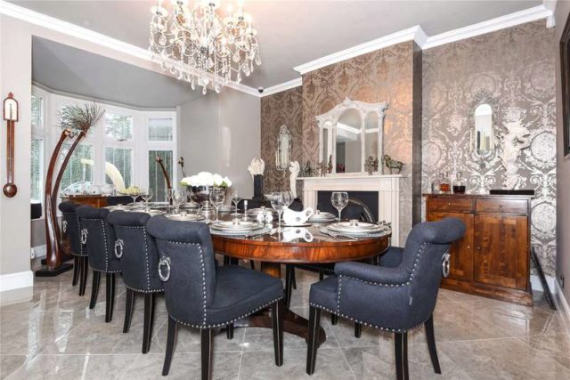 Dining Room 19'1\" (5.82m) into bay x 15'8\" (4.78m). Feature fireplace.