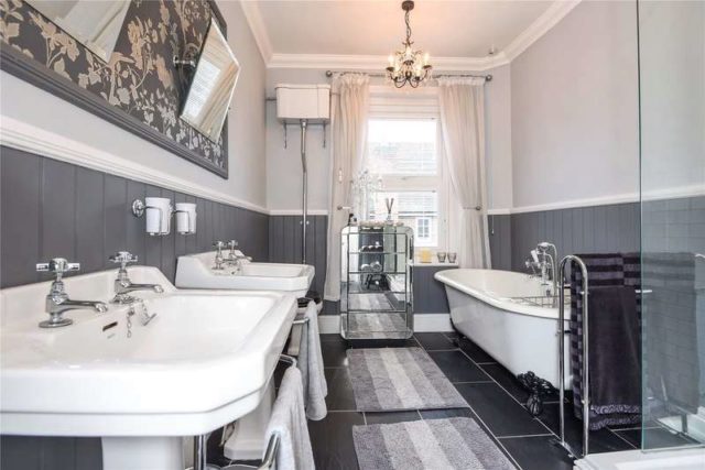 Bathroom 11'10\" x 7'9\" (3.6m x 2.36m). Five piece suite comprising a claw foot bath, walk in double shower cubicle with power shower, pedestal wash hand basin, low level WC, wall mounted heated towel rail, tiled floor, under floor heating.