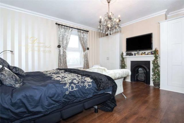 Master Bedroom 16'2\" x 13'5\" (4.93m x 4.1m). Two built-in double wardrobes and a feature fireplace.