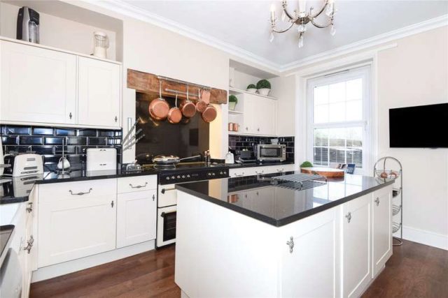 Kitchen 14'1\" x 12'2\" (4.3m x 3.7m). Fitted with a range of eye and base level units with rolled edge granite work surfaces, Belfast sink unit, space and plumbing for dishwasher, space for range cooker with extractor hood over.
