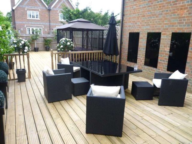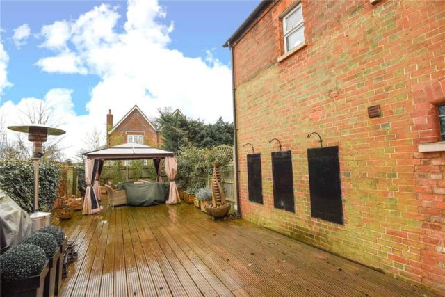OutsideTo The Rear A large decked patio area providing ample seating and entertaining space, enclosed by brick wall, mature shrubs and timber panel fencing.