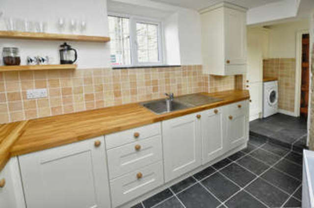 KITCHEN & UTILITY 10' 11" x 7' 0" (3.33m x 2.13m) A beautiful newly fitted 'Shaker' style kitchen providing excellent cupboard storage space and incorporating integrated dishwasher and stainless steel built in oven and gas hob with stainless steel canopy extractor hood over. Oak work surfaces with inset sink and drainer. Double glazed window above. Floating oak shelves. Tiled surrounds. Walk in pantry recess with exposed stone walling, double glazed window and shelving. Slate tiled flooring. Cupboard housing 'Worcester' gas fired boiler. Step up to utility area.